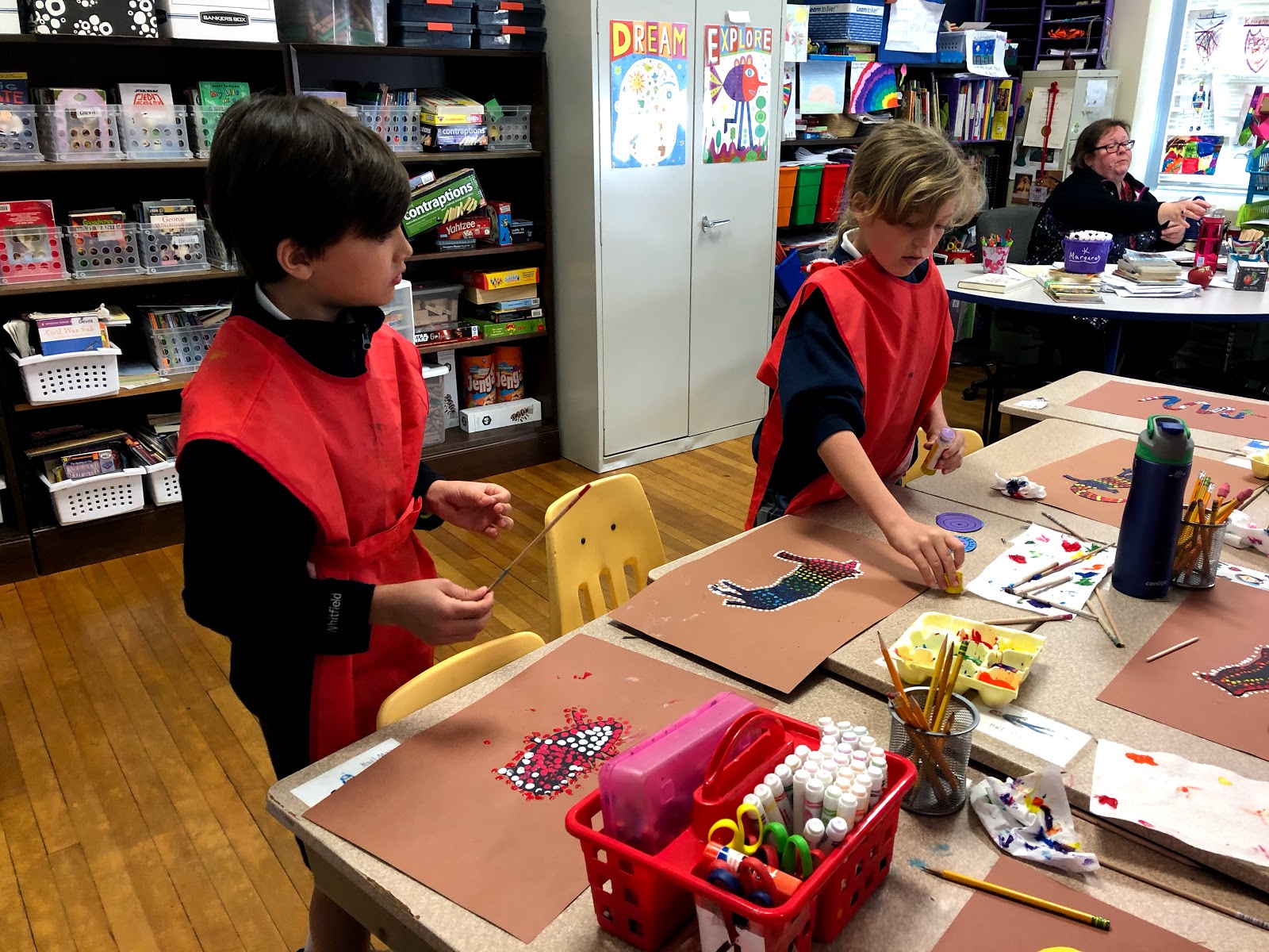 In their latest art project, third graders looked to Australian animals and aboriginal dot paintings for inspiration and technique. They created a dot pattern inside their animal and added decorative circles, symbols of meetings and campsites. For an extra graphic element, some chose to connect their meeting circles with geometric lines.